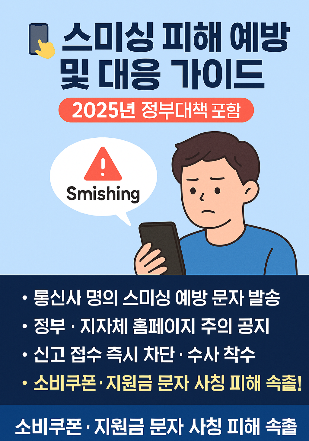 #스미싱피해예방 #스미싱신고방법 #소비쿠폰스미싱 #정부지원금사칭 #피싱문자주의보 #문자결제사기 #금감원스미싱 #한국인터넷진흥원 #2025보안대책 #문자사기 #네이버국민비서 #카카오알림 #토스경고메시지 #정부알림톡 #보이스피싱대응 #모바일보안 #공식앱확인 #스미싱피해조치 #안드로이드보안설정