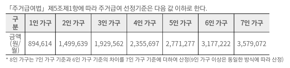 - 주거기준에 부합되면서 가구 소득이 생계 급여 선정 기준액보다 적거나 같은 경우 기준 임대료 전액 지원