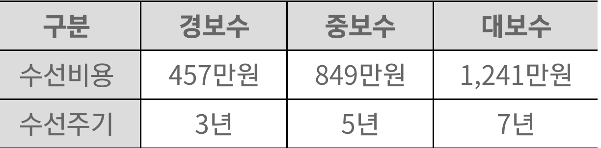 「주거급여법」 제8조 제2항 및 「주거급여 실시에 관한 고시」 제4조 제1항에 따른 보수 범위별 수선비용(수선유지비의 지급기준)은 다음과 같다.