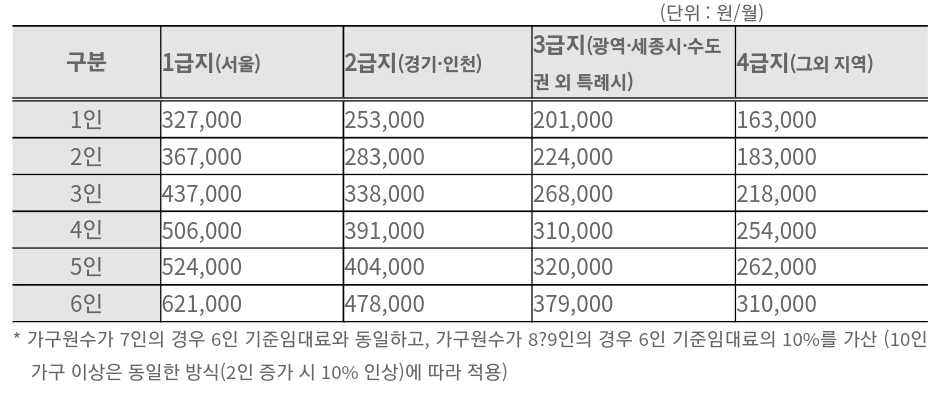 「주거급여법」 제7조 제3항 및 「주거급여 실시에 관한 고시」 제4조 제1항에 따른 기준임대료는 다음과 같다.