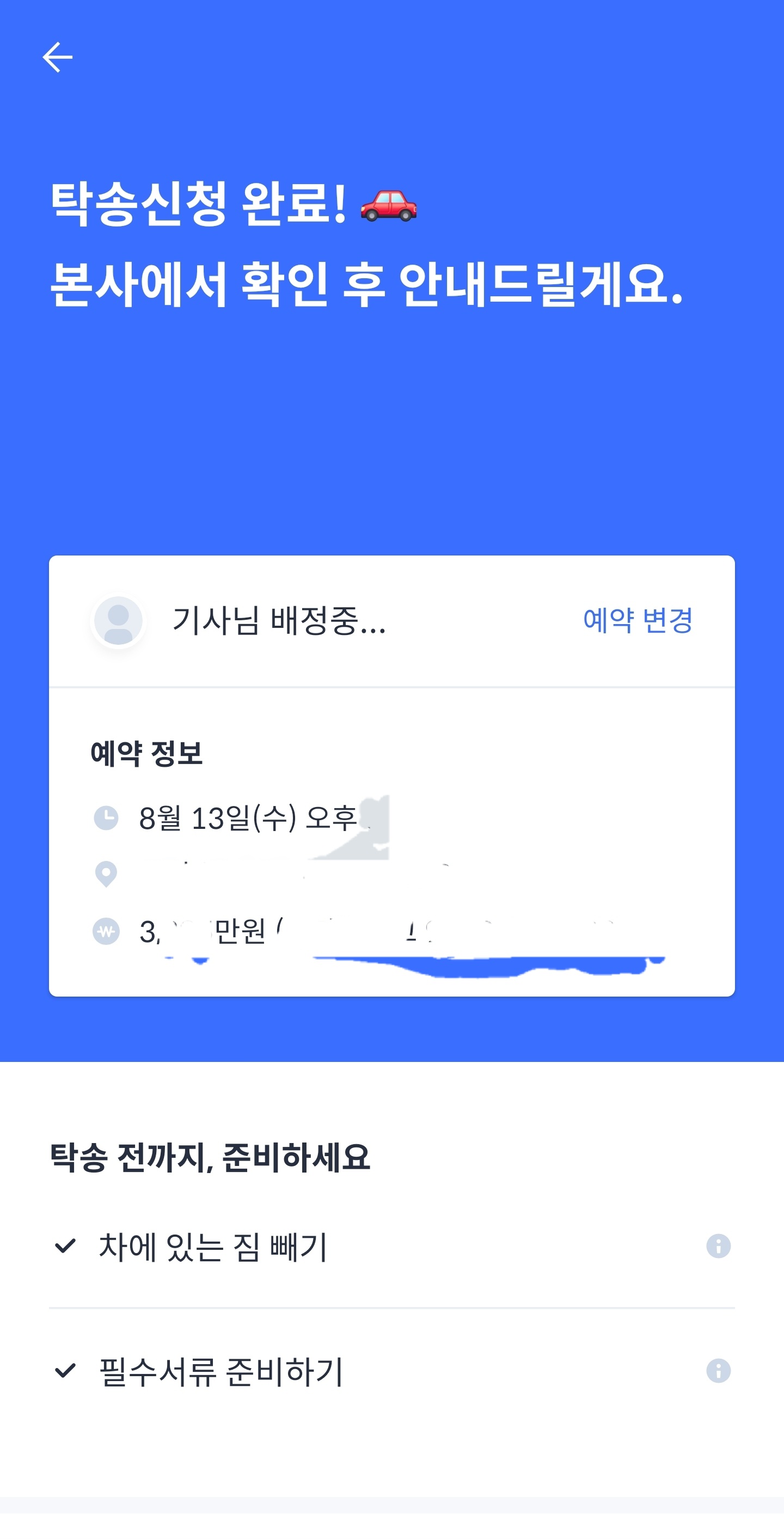 직접 만나지 않고, 탁송기사가 집으로 차량을 수거해 가는 방식이라 시간 절약 측면에서 큰 장점이었습니다.