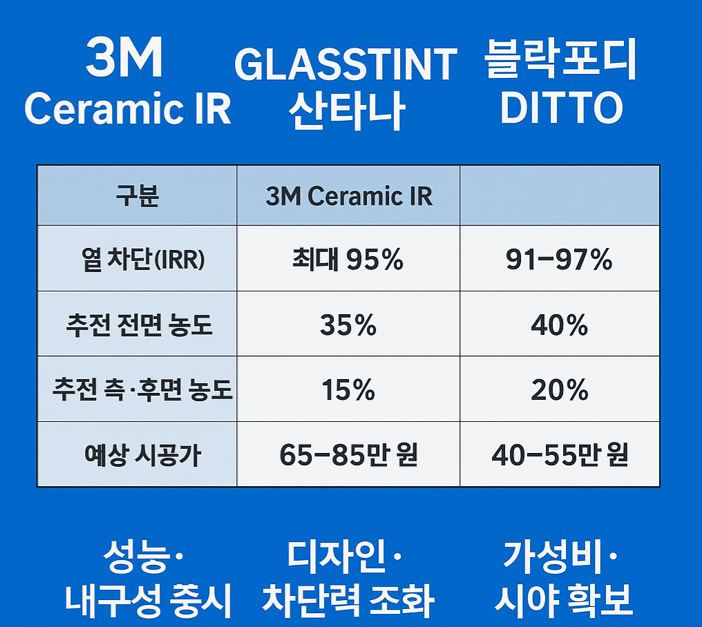| 구분 | 3M Ceramic IR | 글라스틴트 산타나 | 블락포디 DITTO |