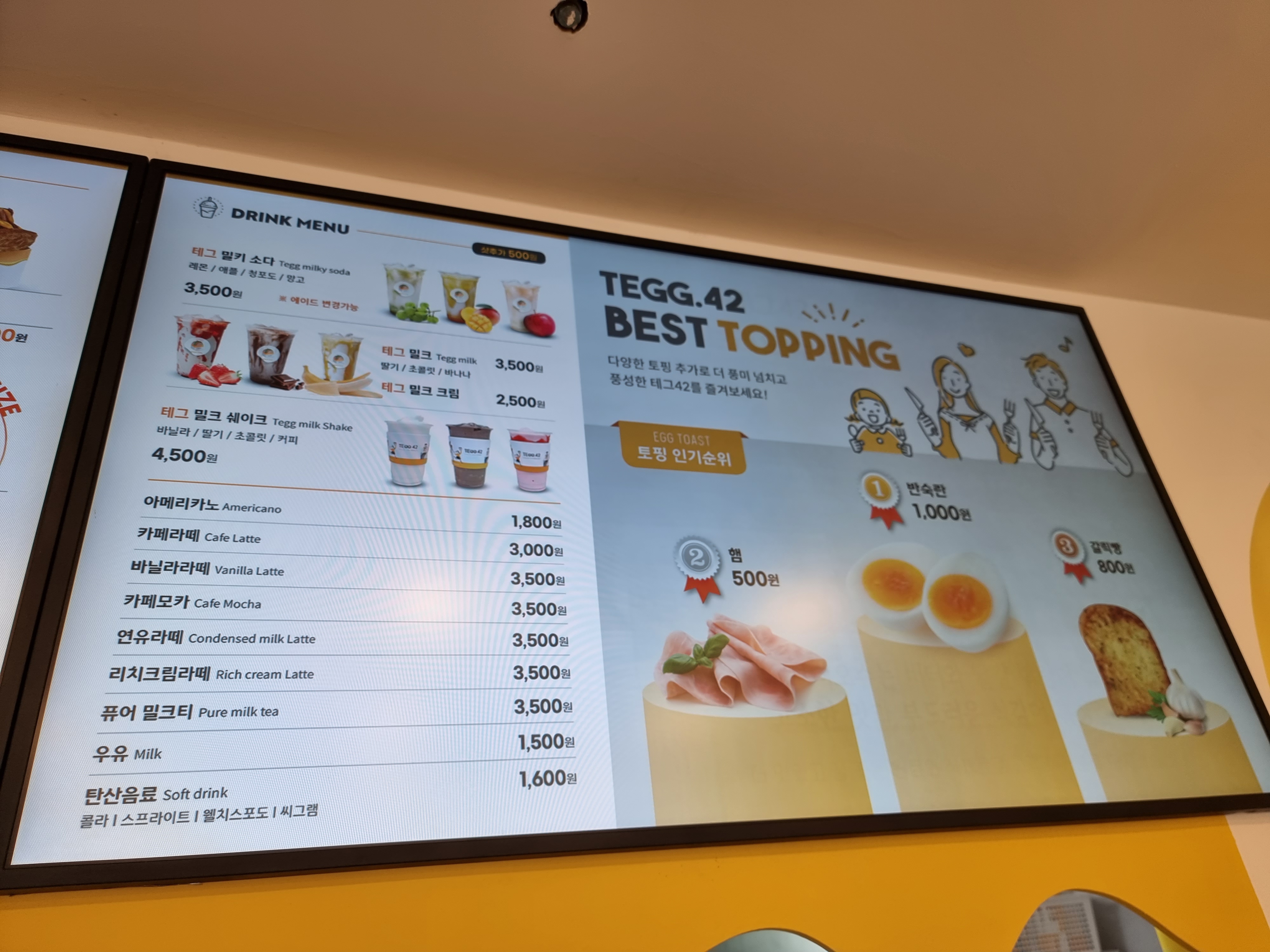 토핑에는 프렌치 토스트, 갈릭 토스트 둘 중에서 빵을 고를 수 있고 계란, 치즈, 햄, 베이컨, 반숙란을 선택할 수 있습니다.