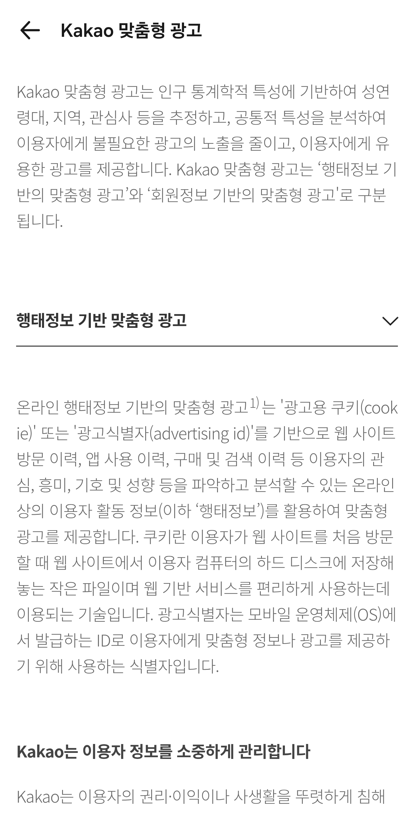 행태정보 기반 광고는 사용자의 클릭, 이용 시간, 피드 상호작용 등 행태 데이터를 분석해 개인화 광고를 제공하는 방식입니다. 이 항목을 비활성화하면 카카오가 내 이용 행태를 기반으로 광고를 추천·집행하는 것을 차단합니다.