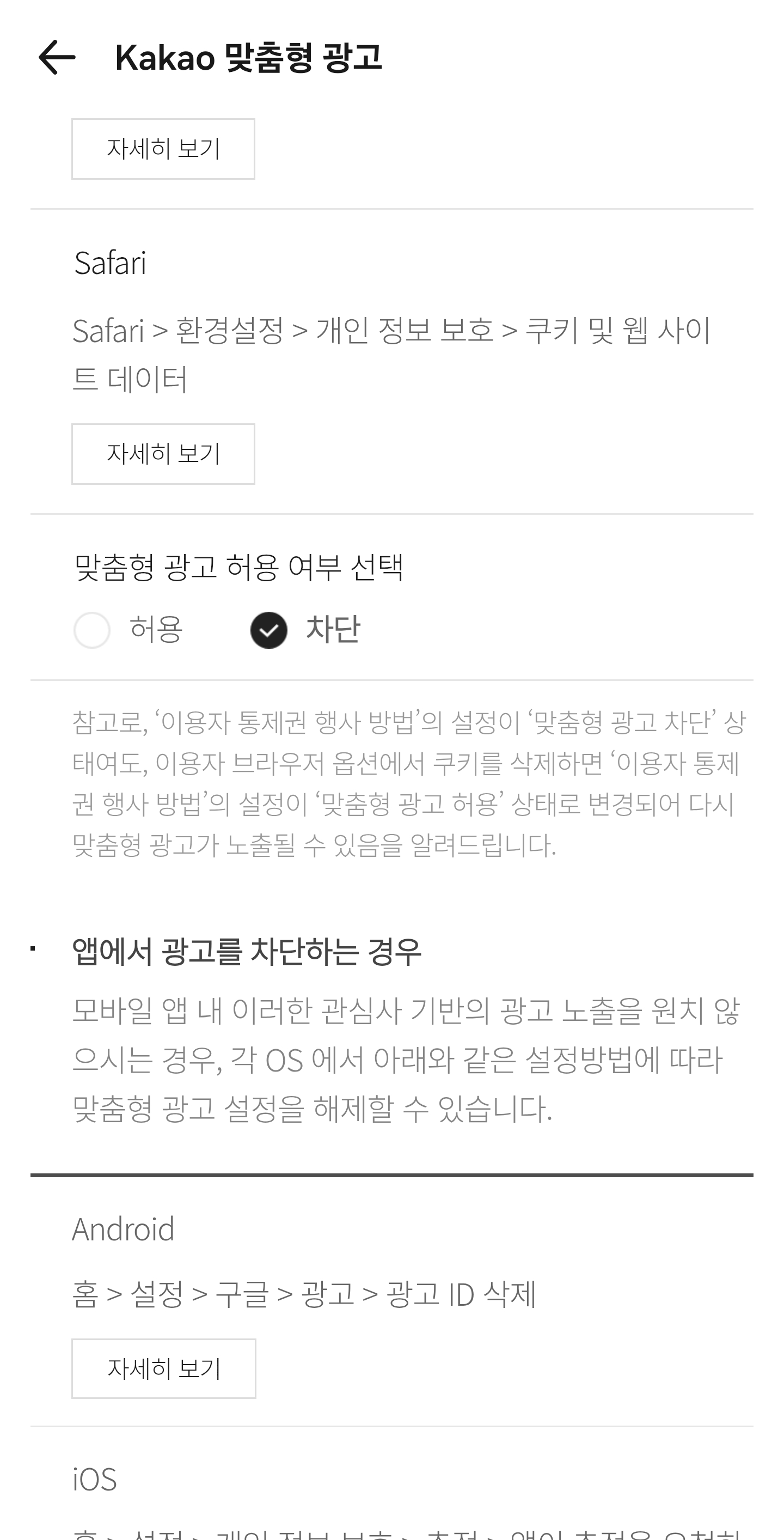 - ‘회원정보 기반 맞춤형 광고’로 이동하여 허용 → 차단으로 전환