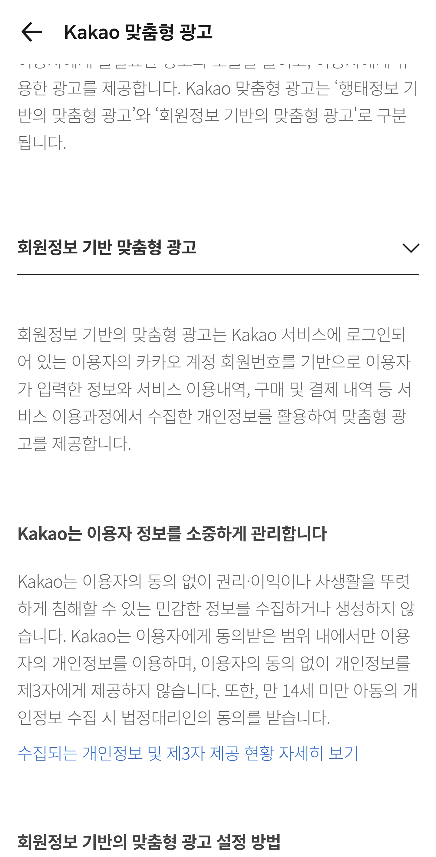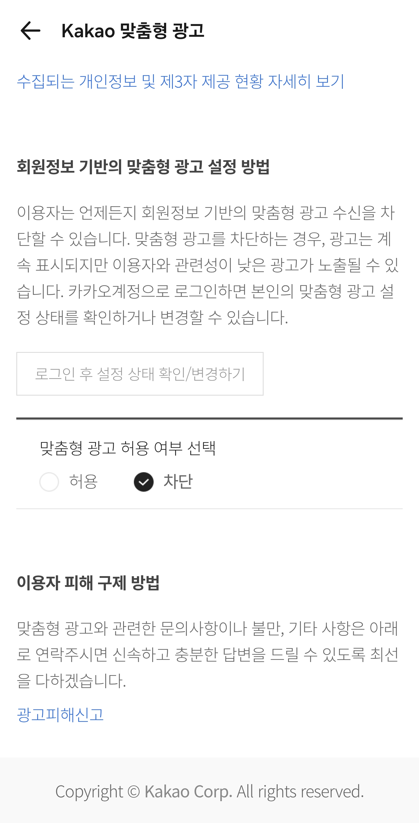 카카오는 회원 정보(연령, 성별 등)와 활동 데이터를 조합해 타깃 광고를 노출합니다. 개인정보 기반 광고를 차단하면 광고사가 내 프로필 정보를 이용한 광고 집행을 할 수 없게 됩니다.